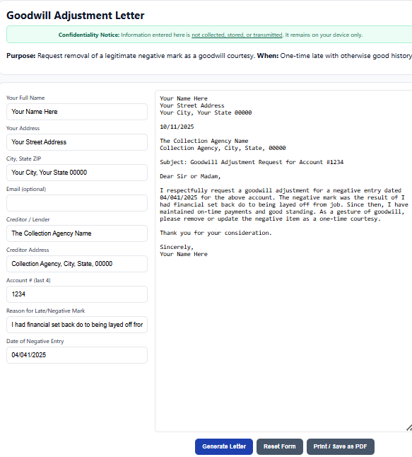 A Goodwill Adjustment Letter politely asks a creditor to remove or re-code a legitimate negative mark (usually a late payment) as a courtesy based on your overall positive history or a temporary hardship that’s been resolved. It’s not a dispute of accuracy—it’s a request for leniency. When to Use:
